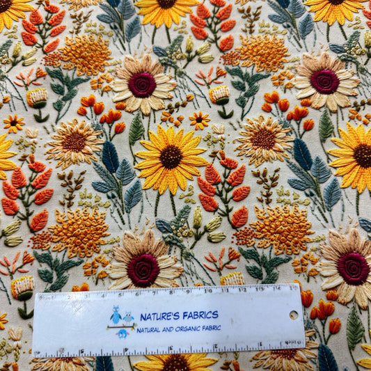 Embroidered Sunflowers on Organic Cotton/Spandex Jersey Fabric