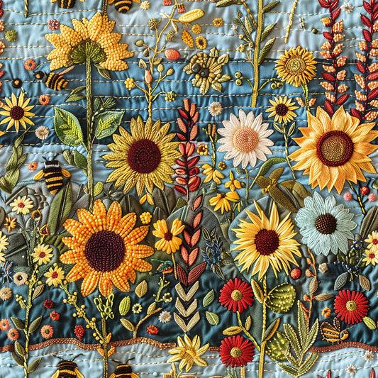 Embroidered Sunflowers and Bees on Bamboo Stretch French Terry Fabric