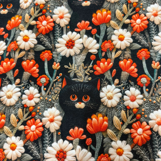 Embroidered Black Cats in the Garden on Bamboo/Spandex Jersey Fabric