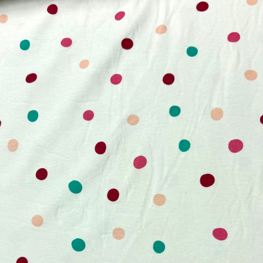 Pink, Rose and Teal Dots on Off White Bamboo/Spandex Jersey Fabric - Printed in the USA