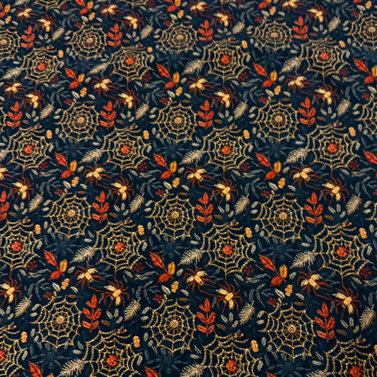 Embroidered Spiders and Webs on Organic Cotton/Spandex Jersey Fabric