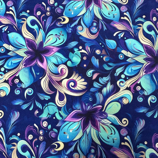 Aqua and Purple Floral on Navy Organic Cotton/Spandex Jersey Fabric