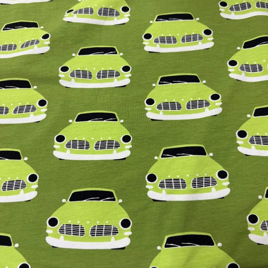 Green Vintage Cars on Green Organic Cotton/Spandex Jersey Fabric