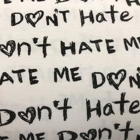 Don't Hate Me-on White Cotton/Poly French Terry Fabric