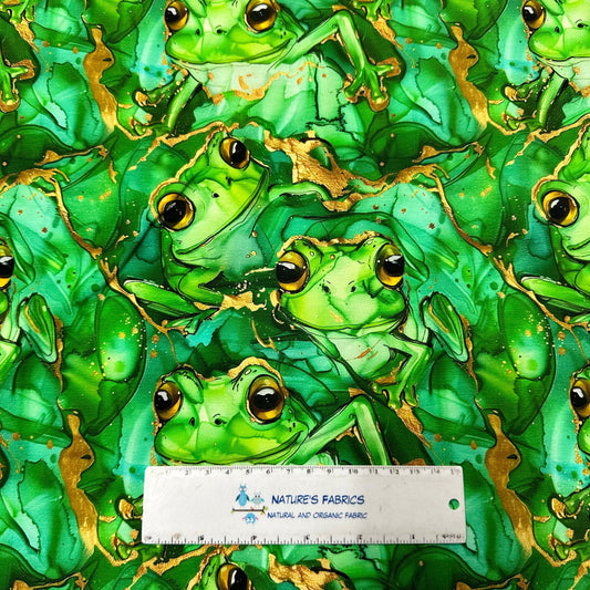 Green Tree Frogs Alcohol Ink on Organic Cotton/Spandex Jersey Fabric