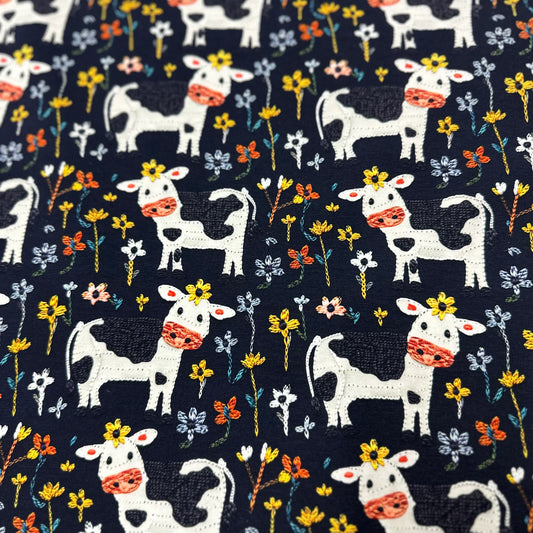 Appliqued Cows on Organic Cotton/Spandex Jersey Fabric