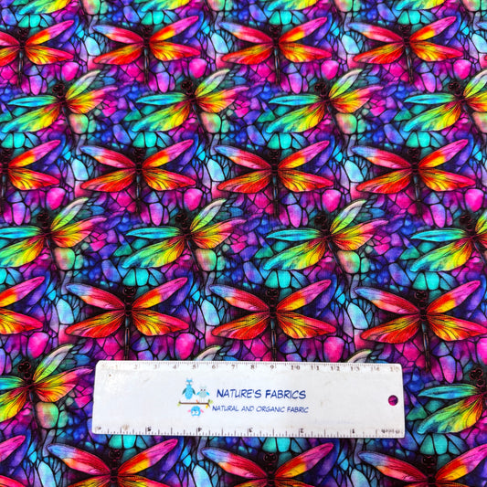 Rainbow Dragonflies on Organic Cotton/Spandex Jersey Fabric