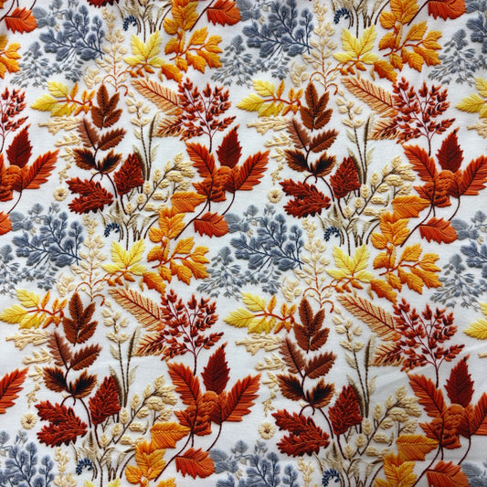 Embroidered Fall Leaves on Organic Cotton/Spandex Jersey Fabric