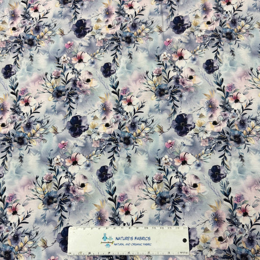 Winter Blue Flowers on Organic Cotton/Spandex Jersey Fabric