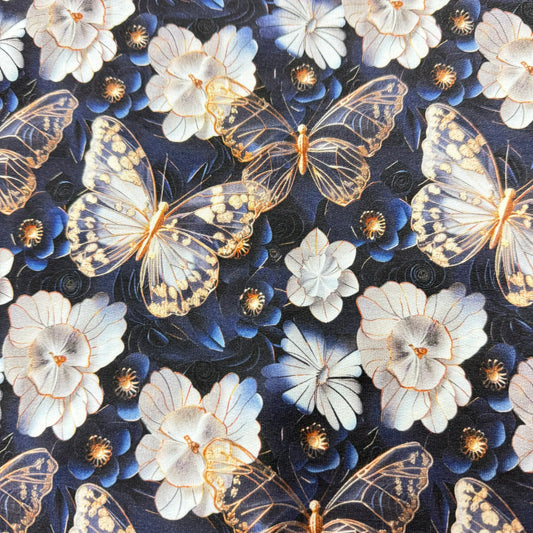 Gold Butterflies on Navy Organic Cotton Stretch French Terry Fabric