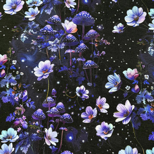 Purple Starry Mushroom Garden on Organic Cotton Stretch French Terry Fabrics