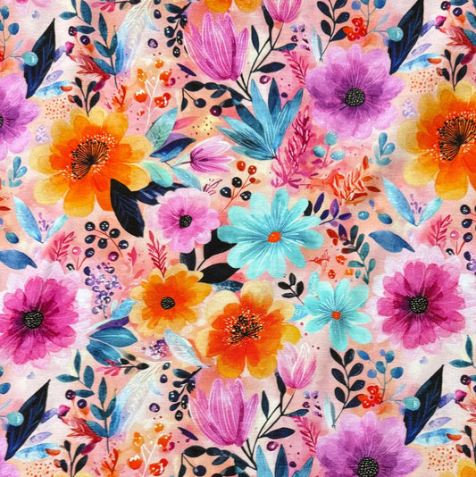 Pink, Teal and Orange Flowers on Organic Cotton Stretch French Terry Fabric