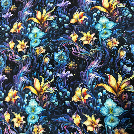 Vivid Floral Bioluminescence on Polyester/Spandex Jersey Fabric