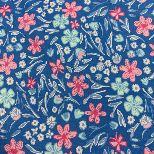 Pink and Blue Floral on Blue Bamboo/Spandex Jersey Fabric - 200 GSM