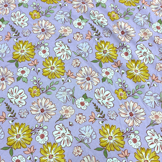 Pink and Yellow Flowers on Purple Bamboo/Spandex Jersey Fabric - 200 GSM