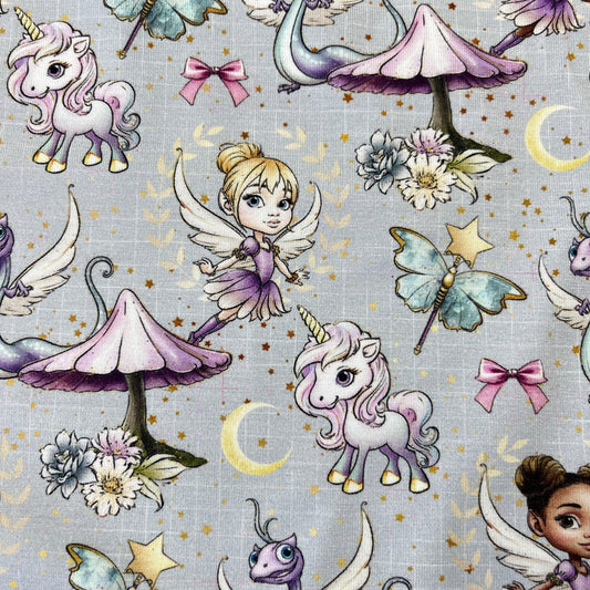 Fairies and Friends on Gray Bamboo/Spandex Jersey Fabric