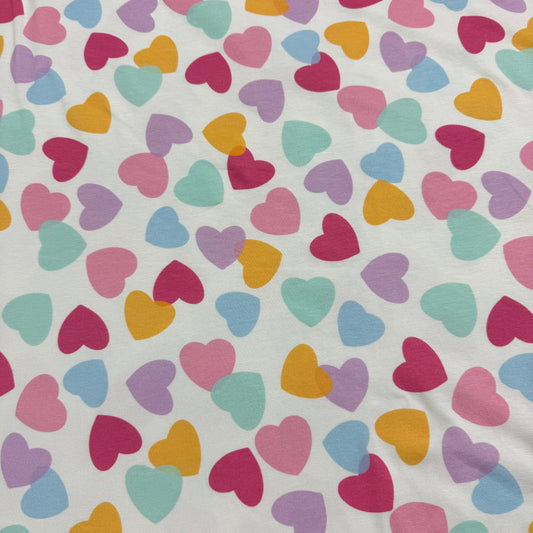 Pastel Heart Toss on Off White Bamboo/Spandex Jersey Fabric - Printed in the USA