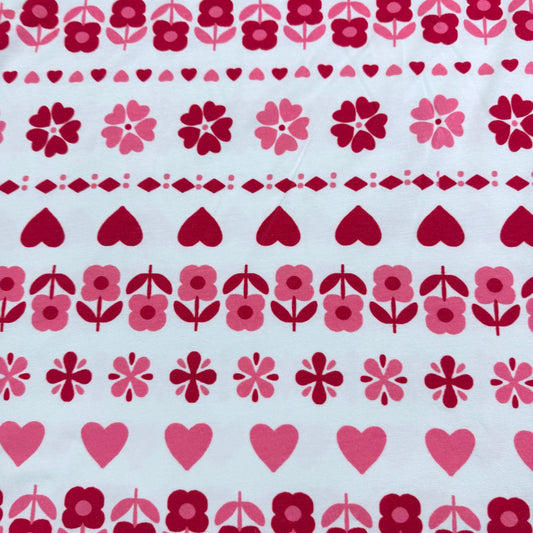 Pink Hearts and Daisies on Off White Bamboo/Spandex Jersey Fabric - Printed in the USA