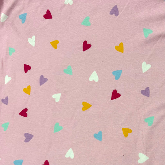 Rainbow Heart Toss on Pink Bamboo/Spandex Jersey Fabric - Printed in the USA
