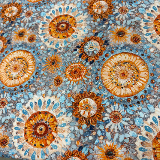 Orange Mandalas on Blue Bamboo Stretch French Terry Fabric