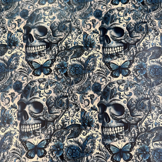 Blue Floral Skulls on Smooth Vinyl Fabric