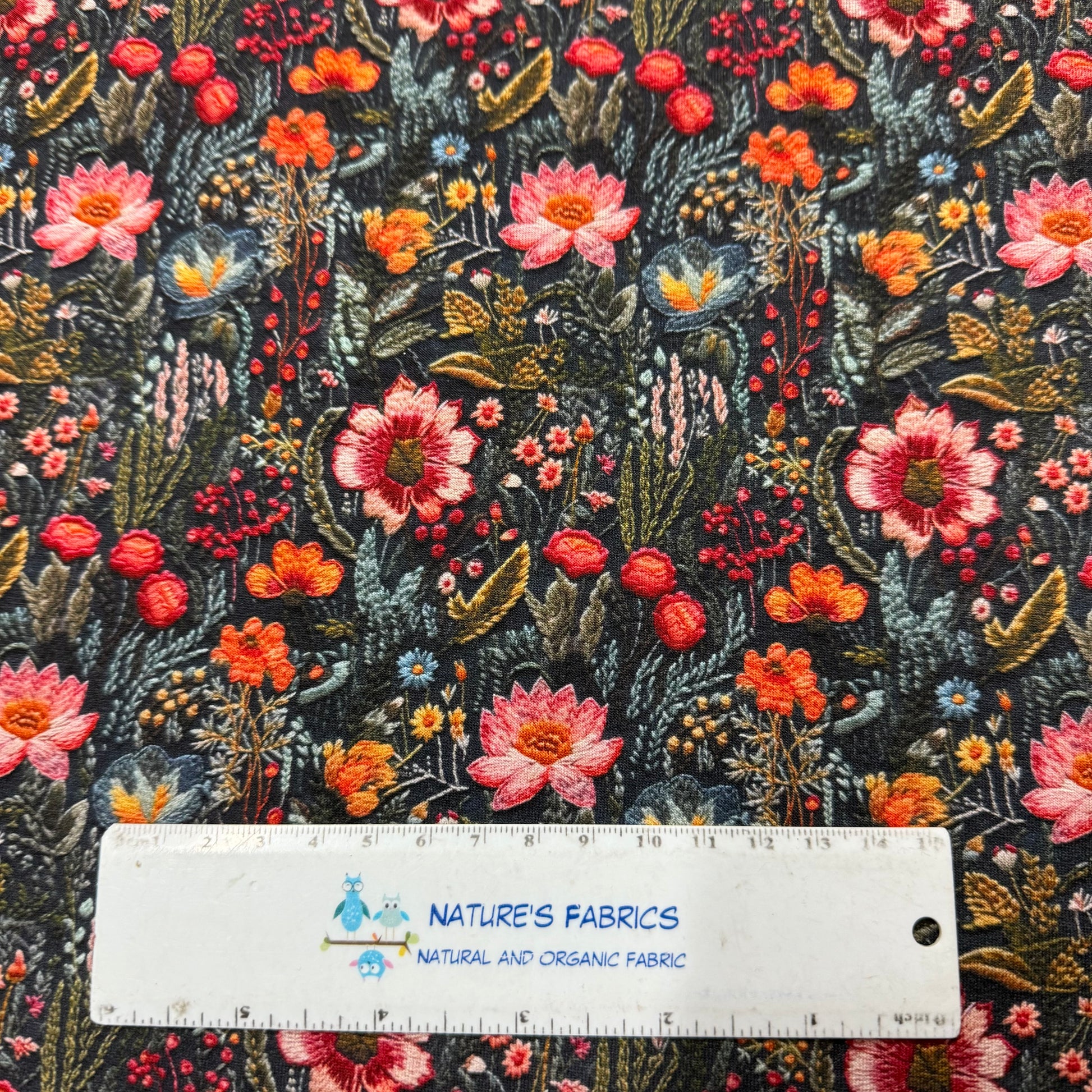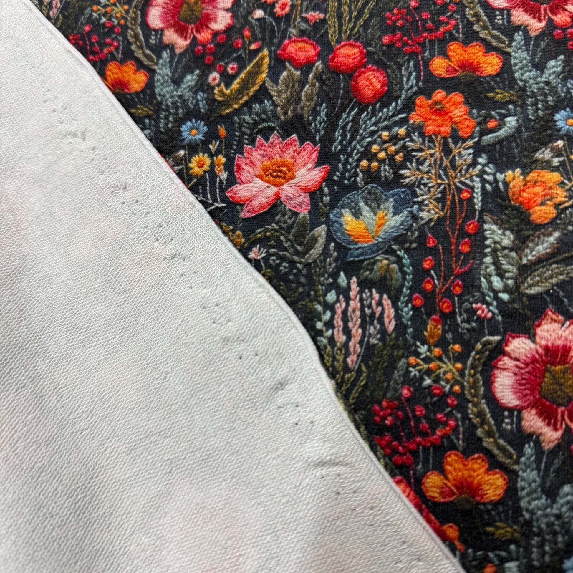 Embroidered Flower Garden on Organic Cotton Stretch French Terry Fabric