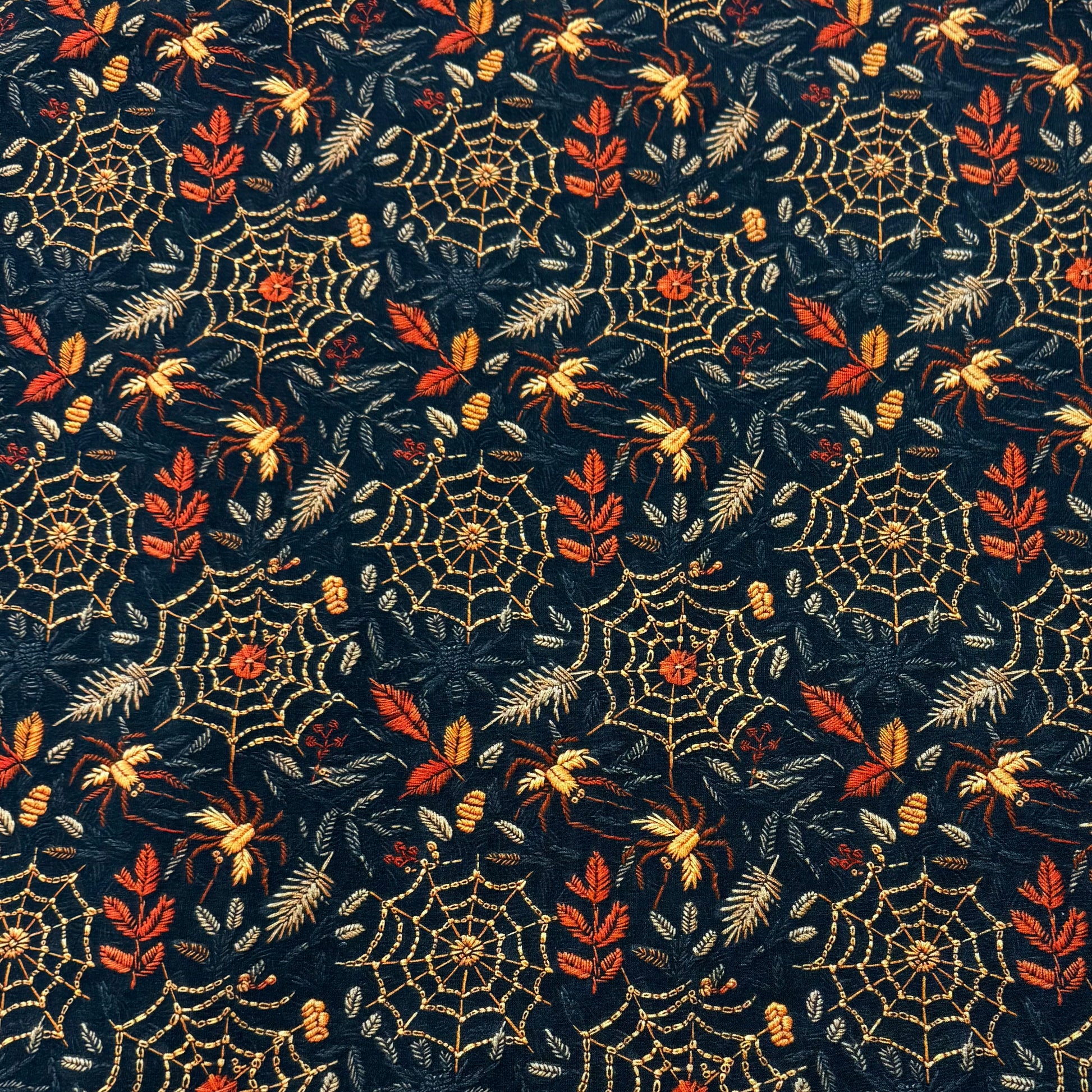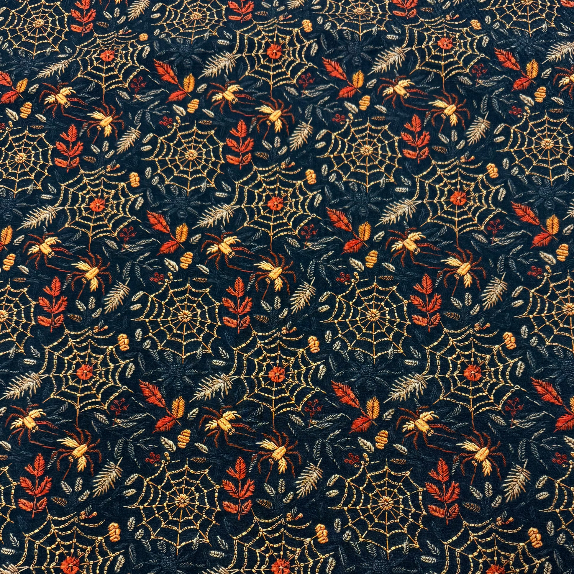 Embroidered Spiders and Webs on Organic Cotton/Spandex Jersey Fabric