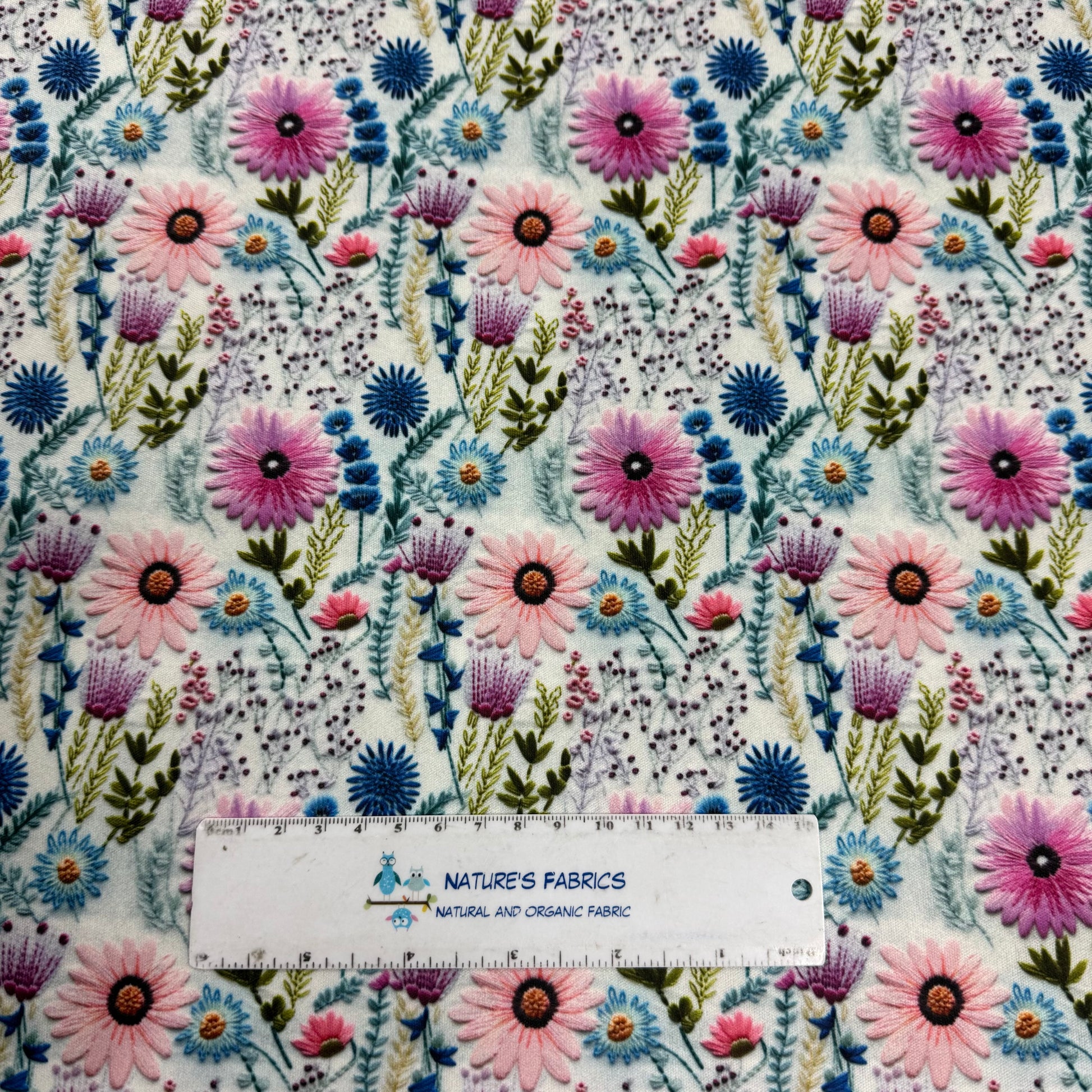 Pink Embroidered Daisies 1 mil PUL Fabric - Made in the USA