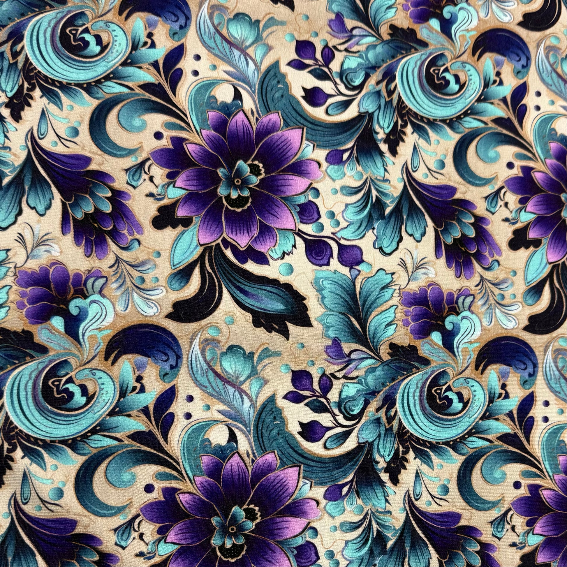 Purple and Aqua Floral on Cream Organic Cotton Stretch French Terry Fabric