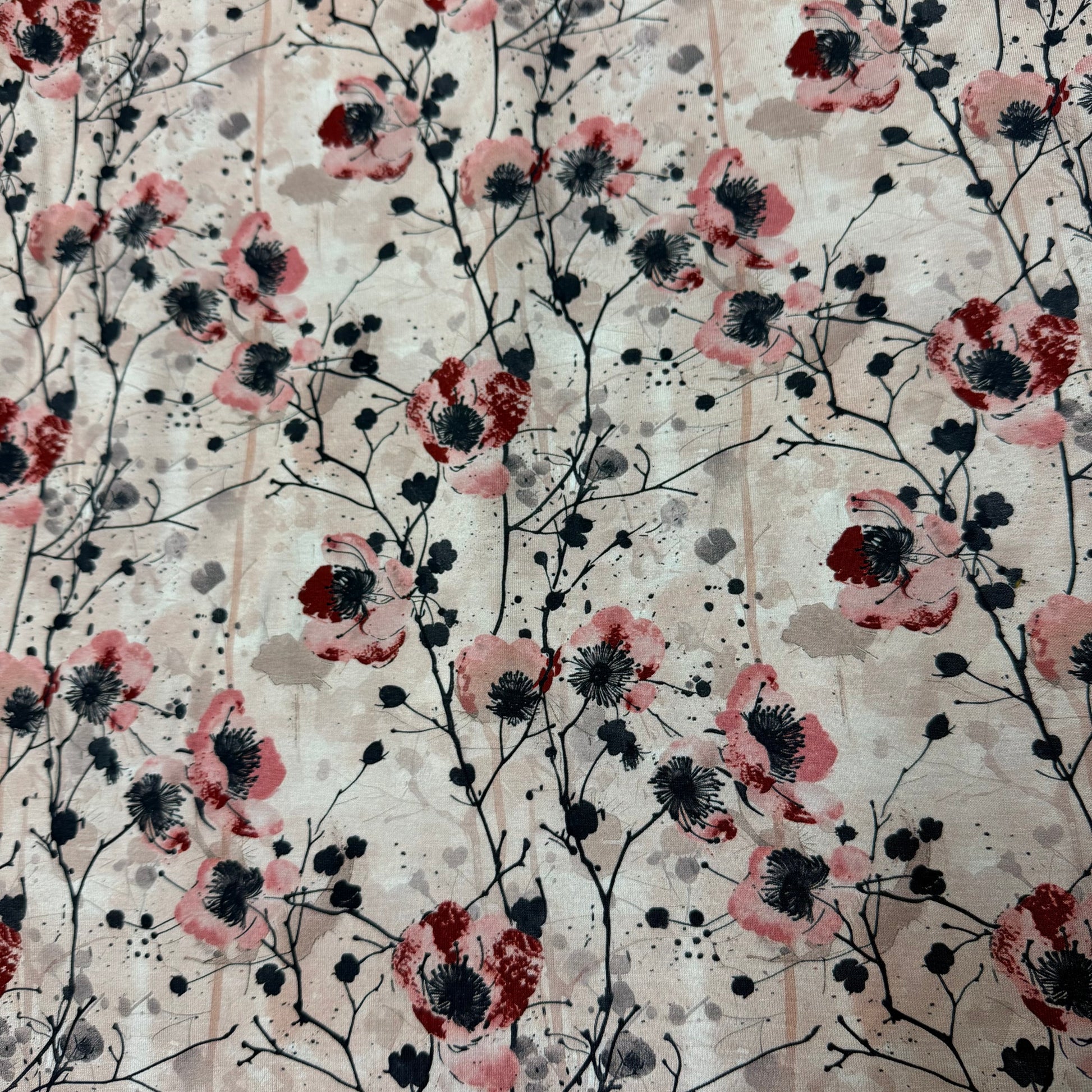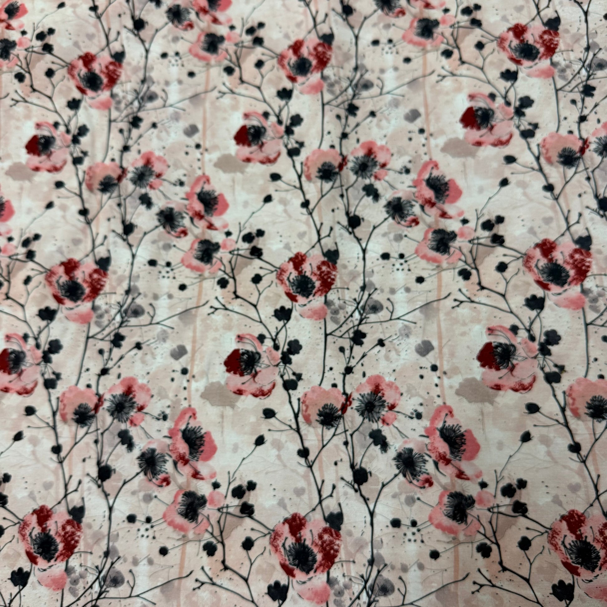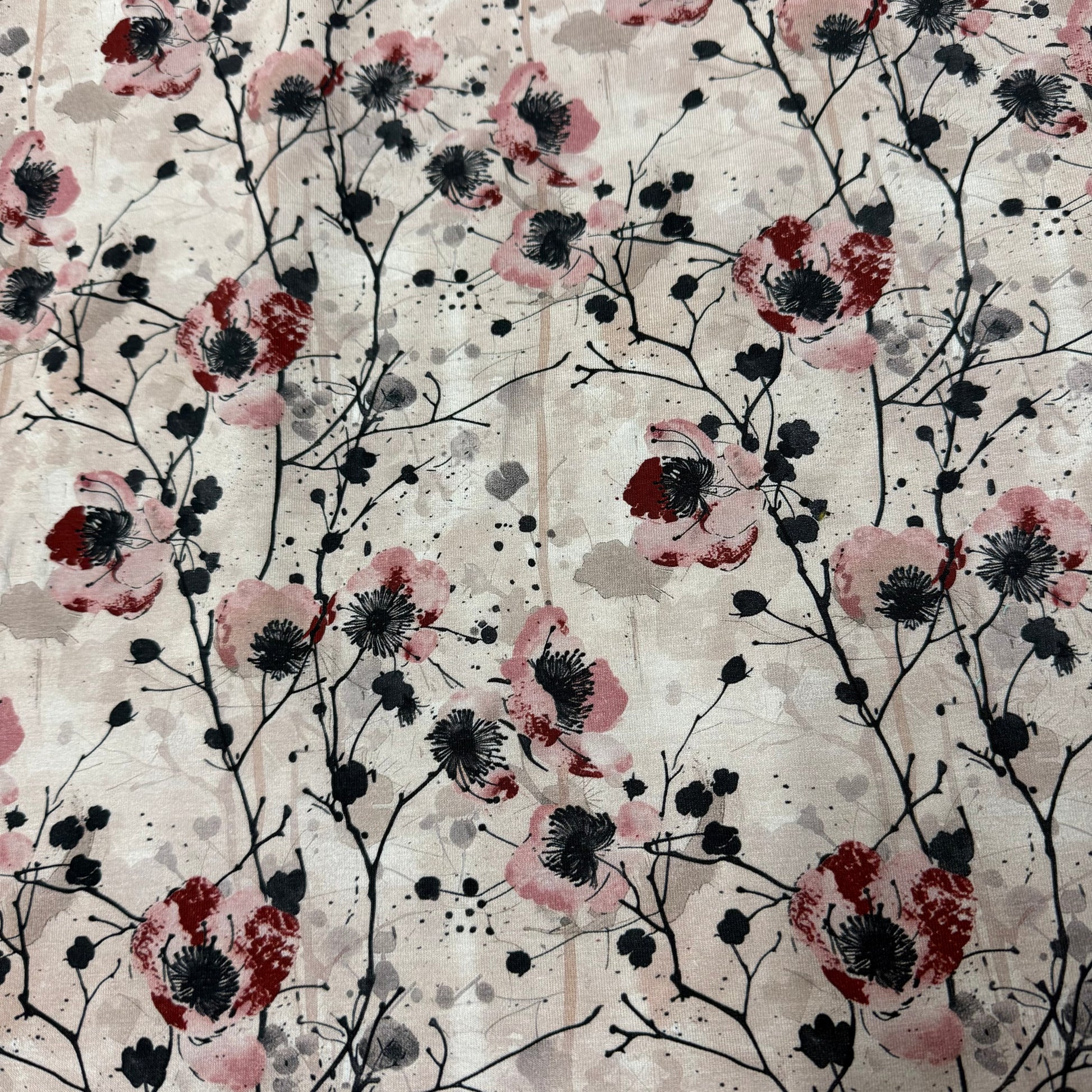 Red and Tan Blossoms on Bamboo Stretch French Terry Fabric