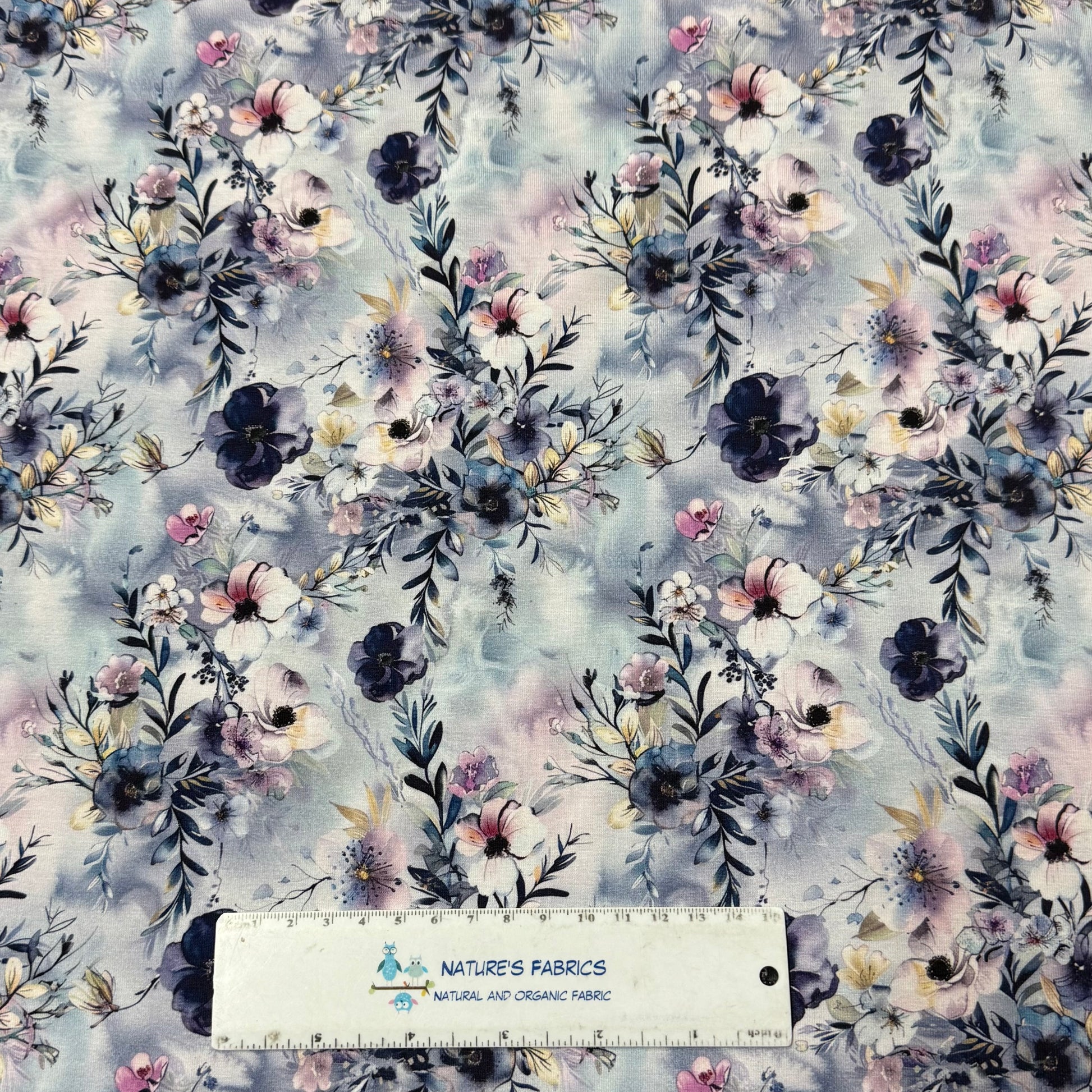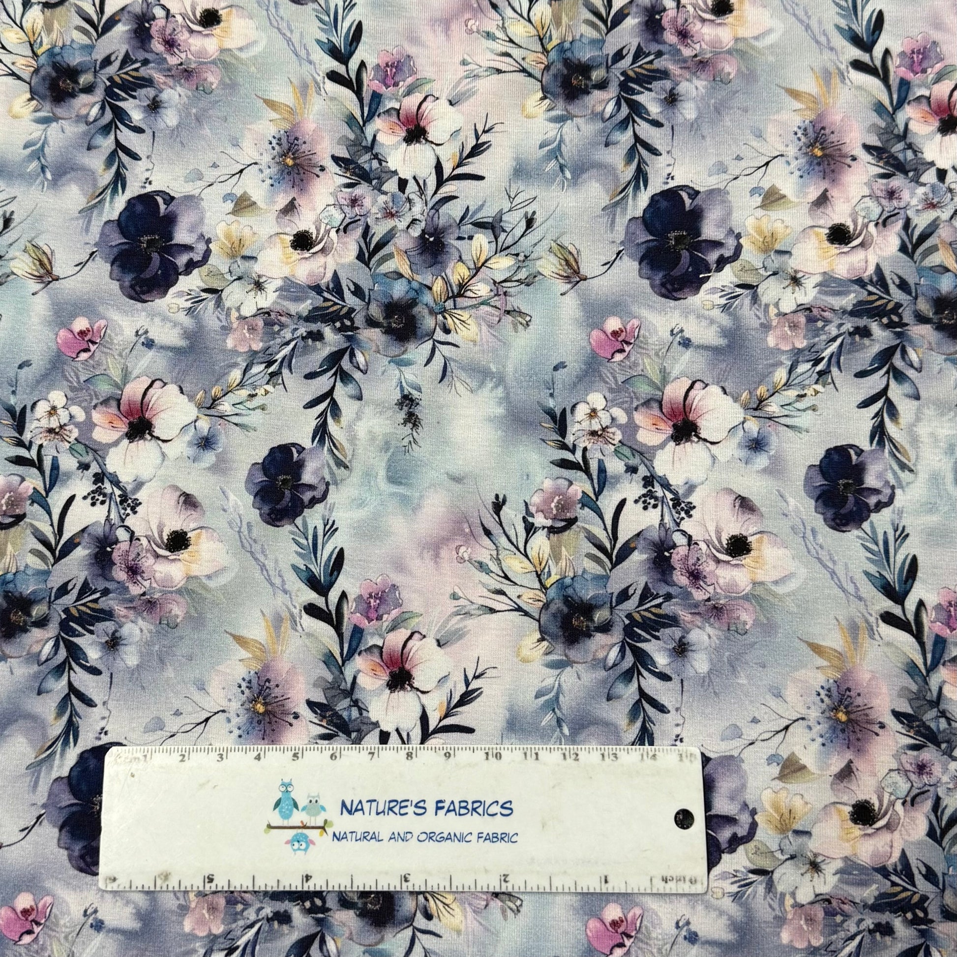 Winter Blue Flowers on Organic Cotton/Spandex Jersey Fabric